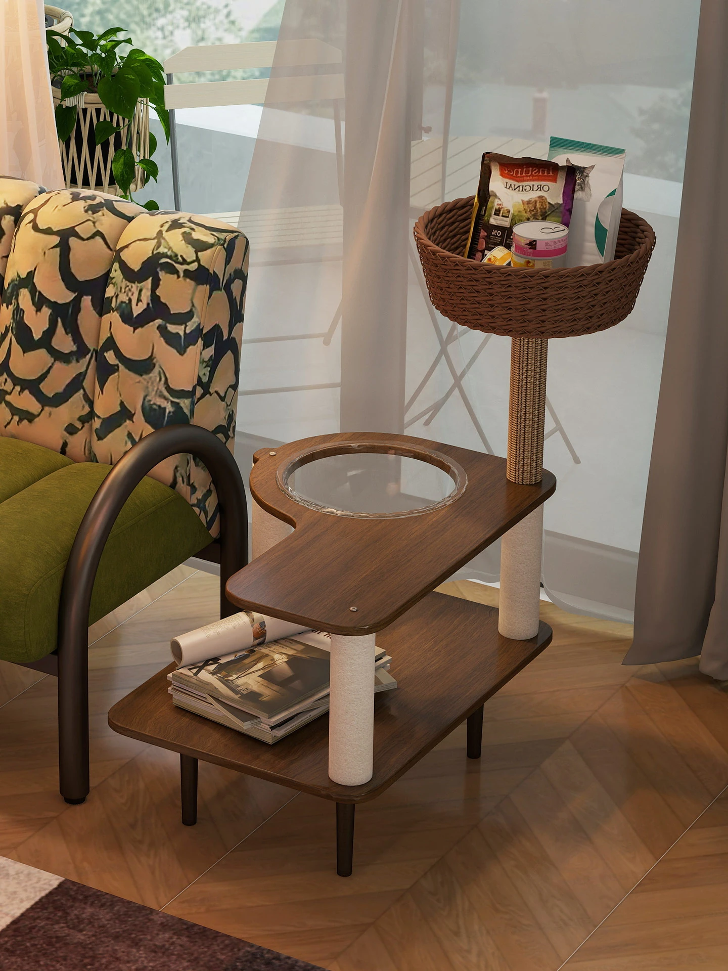ペット用キャットハウスとリビングテーブルが一体化した、猫と人間が共用できる便利なサイドテーブル!小型住宅に最適なキャットタワー付き、移動も簡単なコーナーテーブルです。快適な空間を提供します!