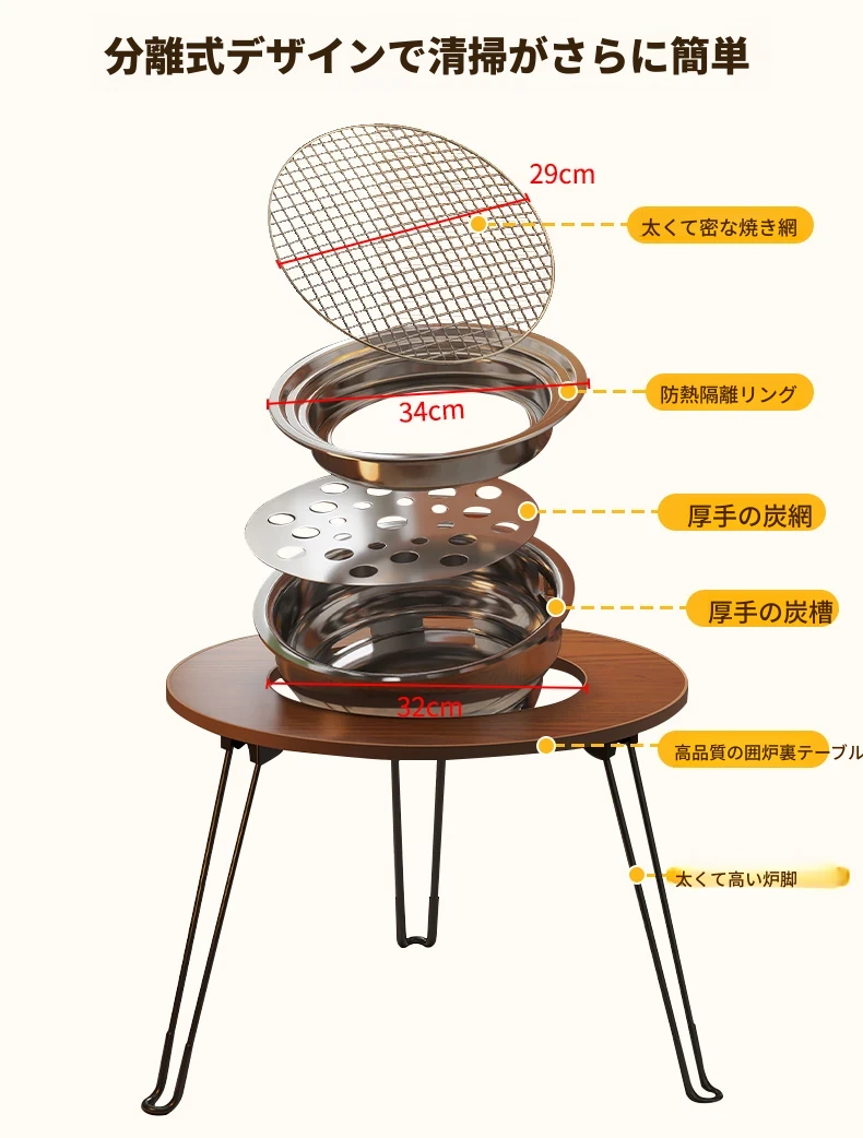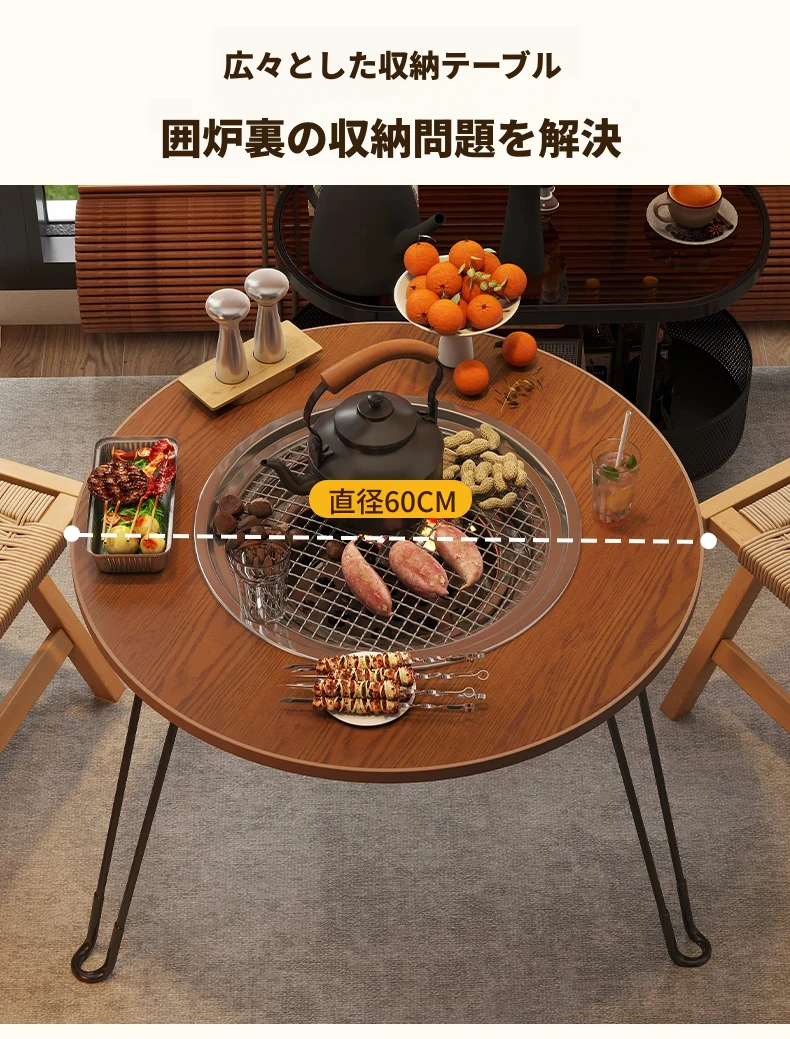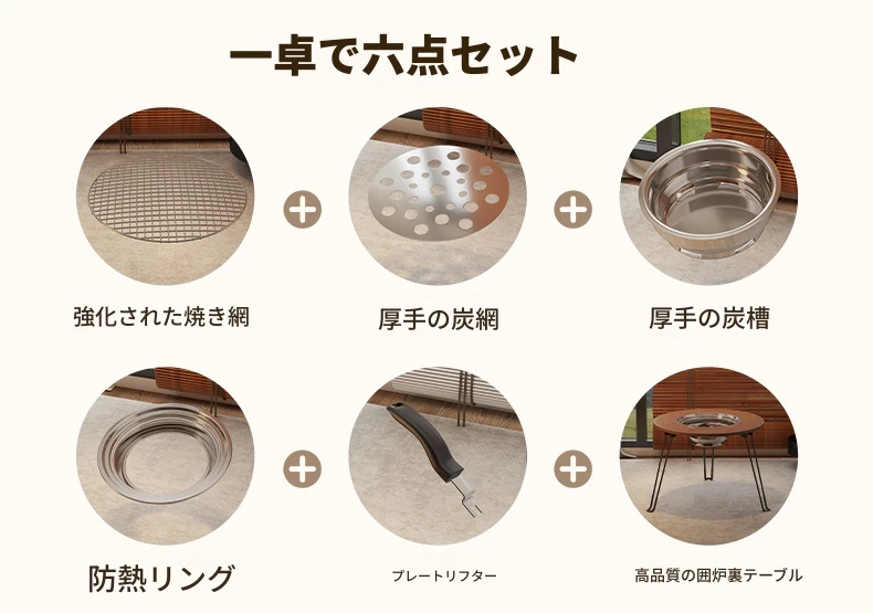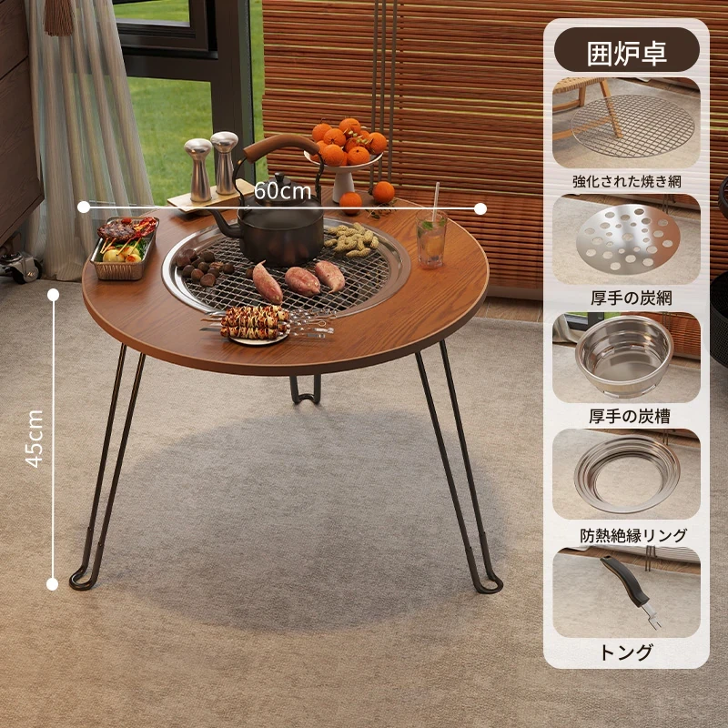 囲炉裏テーブル【焼き網-熱湯防止リング-炭盆/炭トレイ-サービングツール】 1つ購入で6つゲット